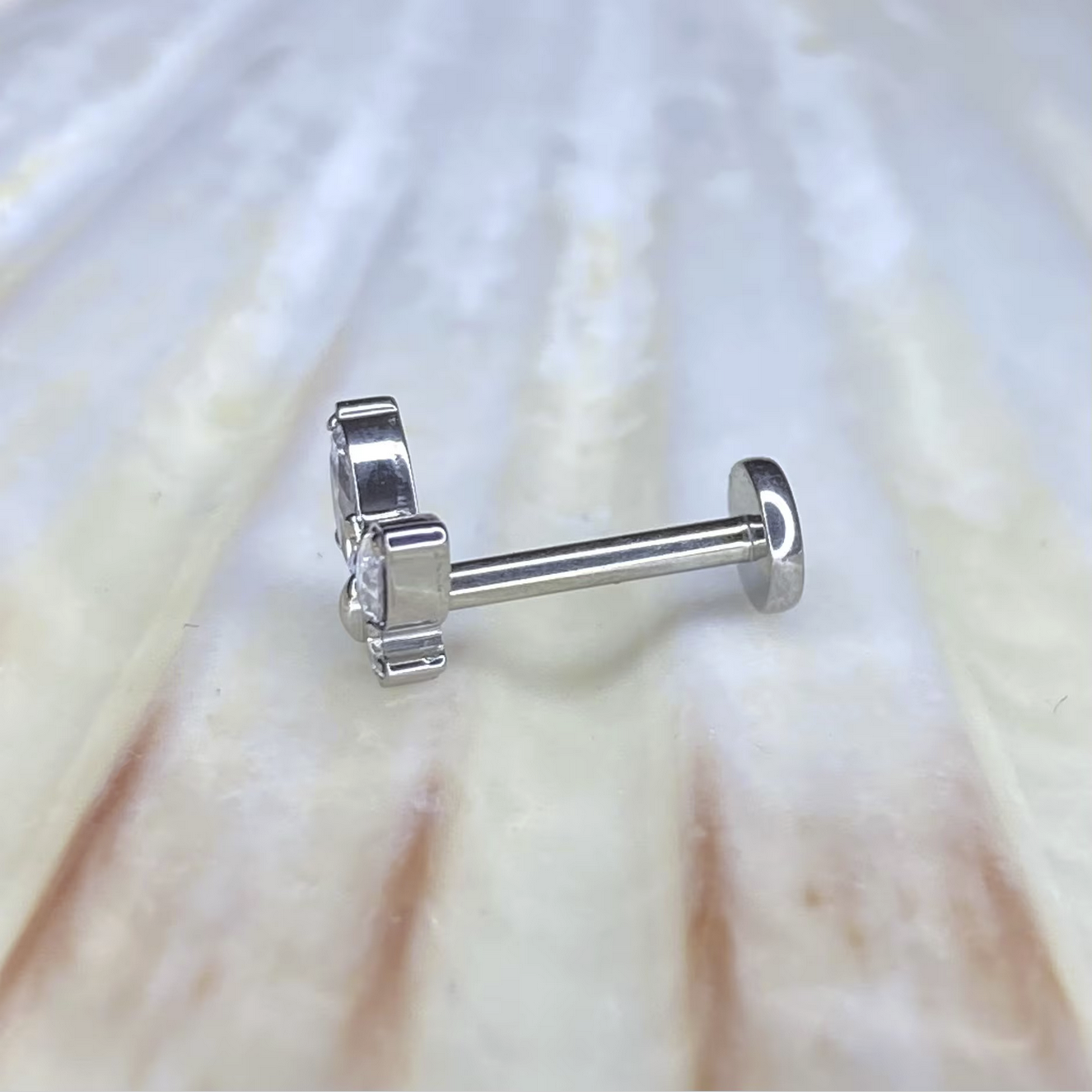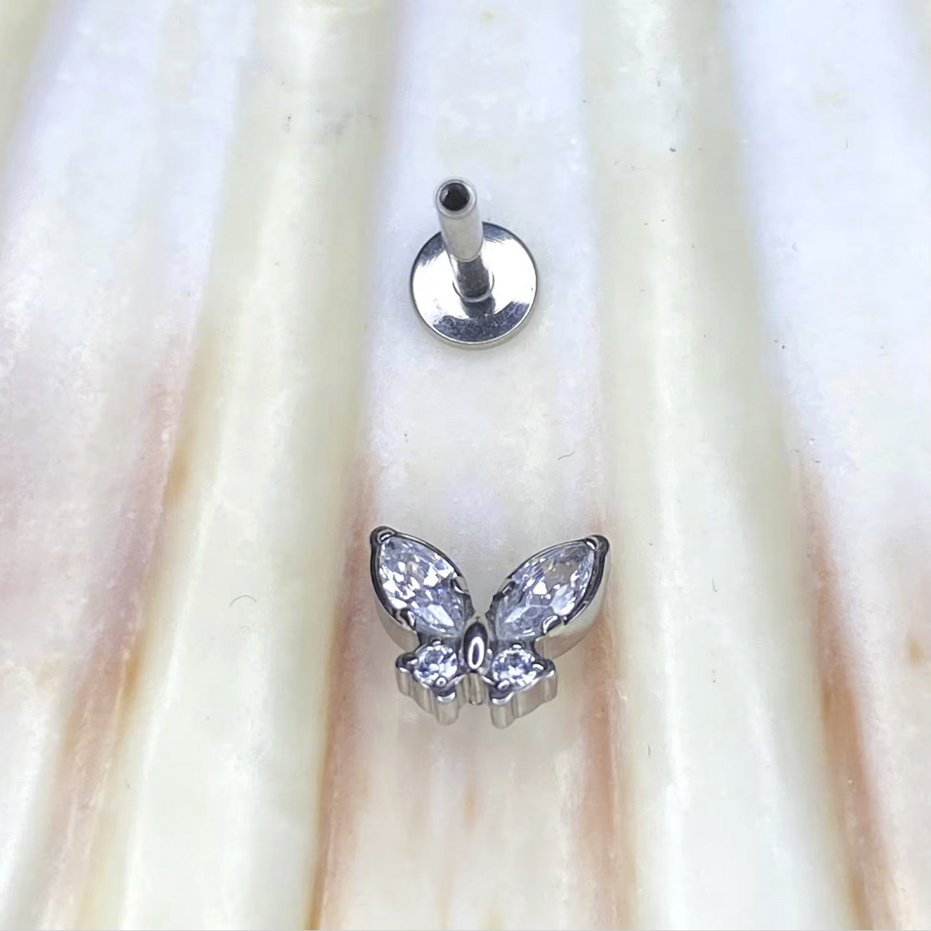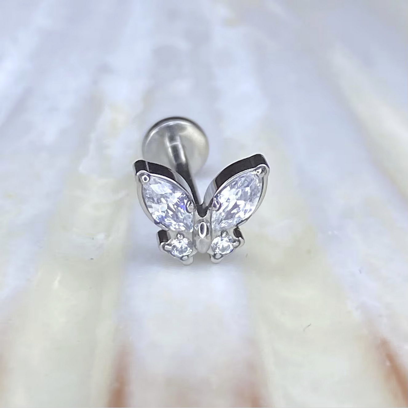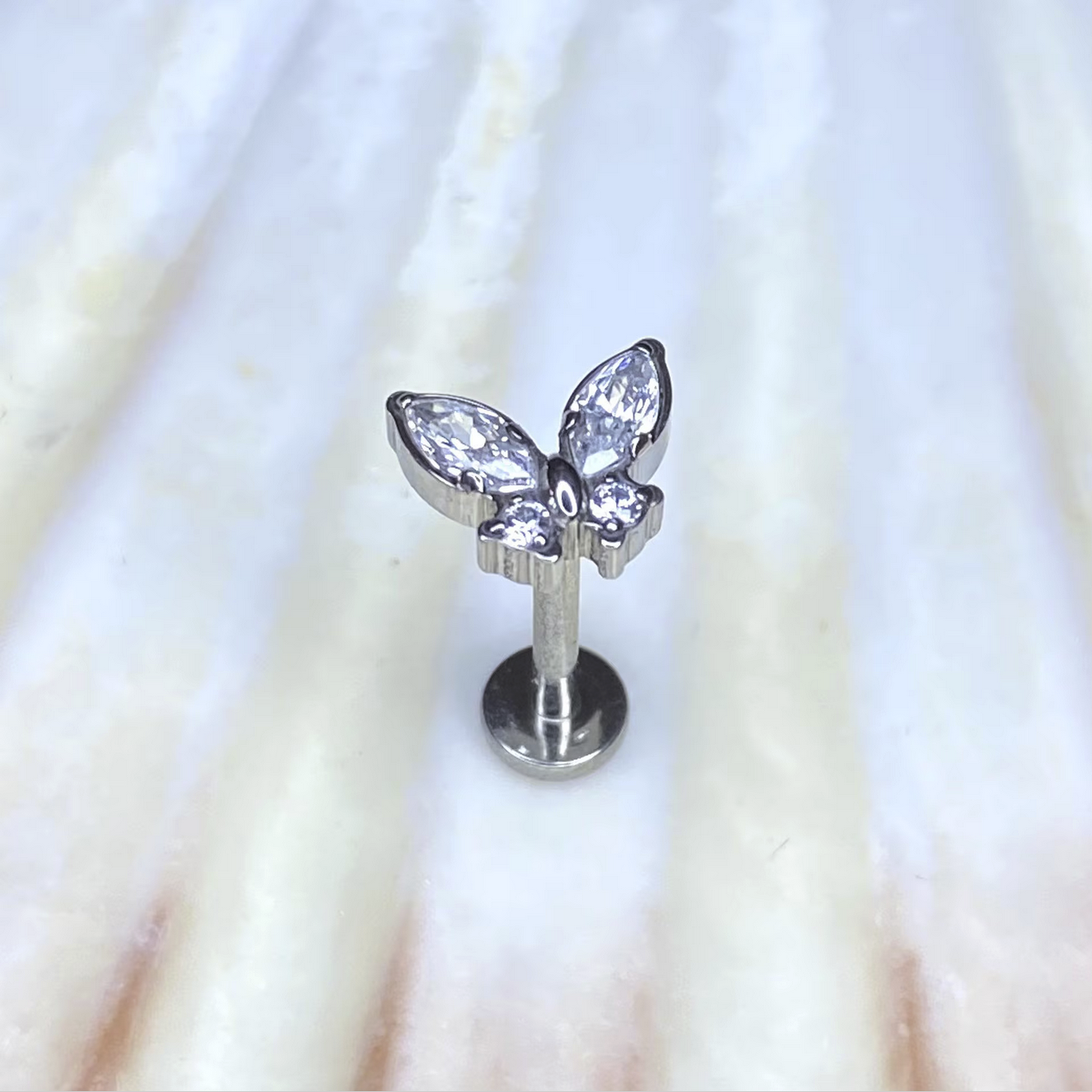 BUTTERFLY Clear Gem Top Medical grade ASTM:F-136 titanium labret 1.2x8/10mm Internal thread conch,helix,tragus,ear lobe flat jewellery