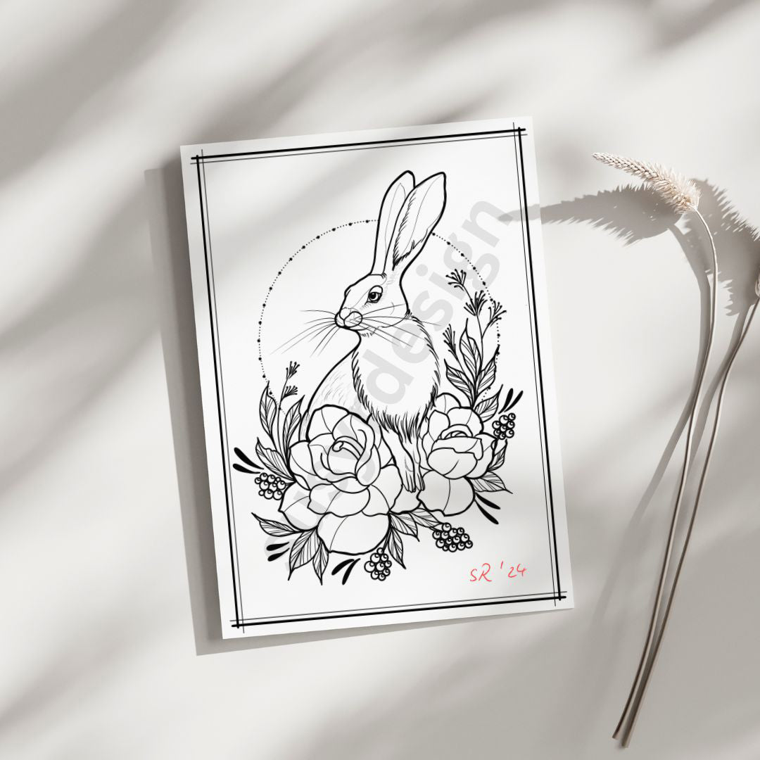 Add a touch of nature-inspired beauty to your body art or creative work with this exquisite piece featuring a happy Hare with Roses.