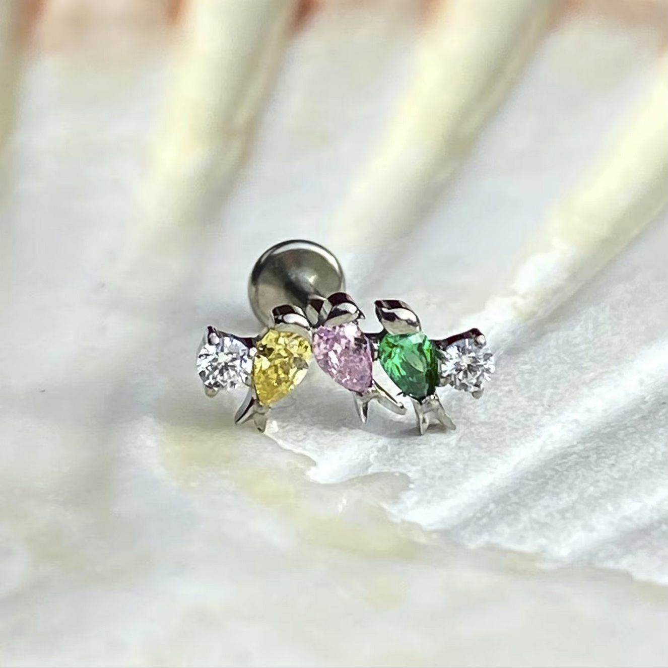 Top: 3 birds with clear, yellow, pink and green colour gems